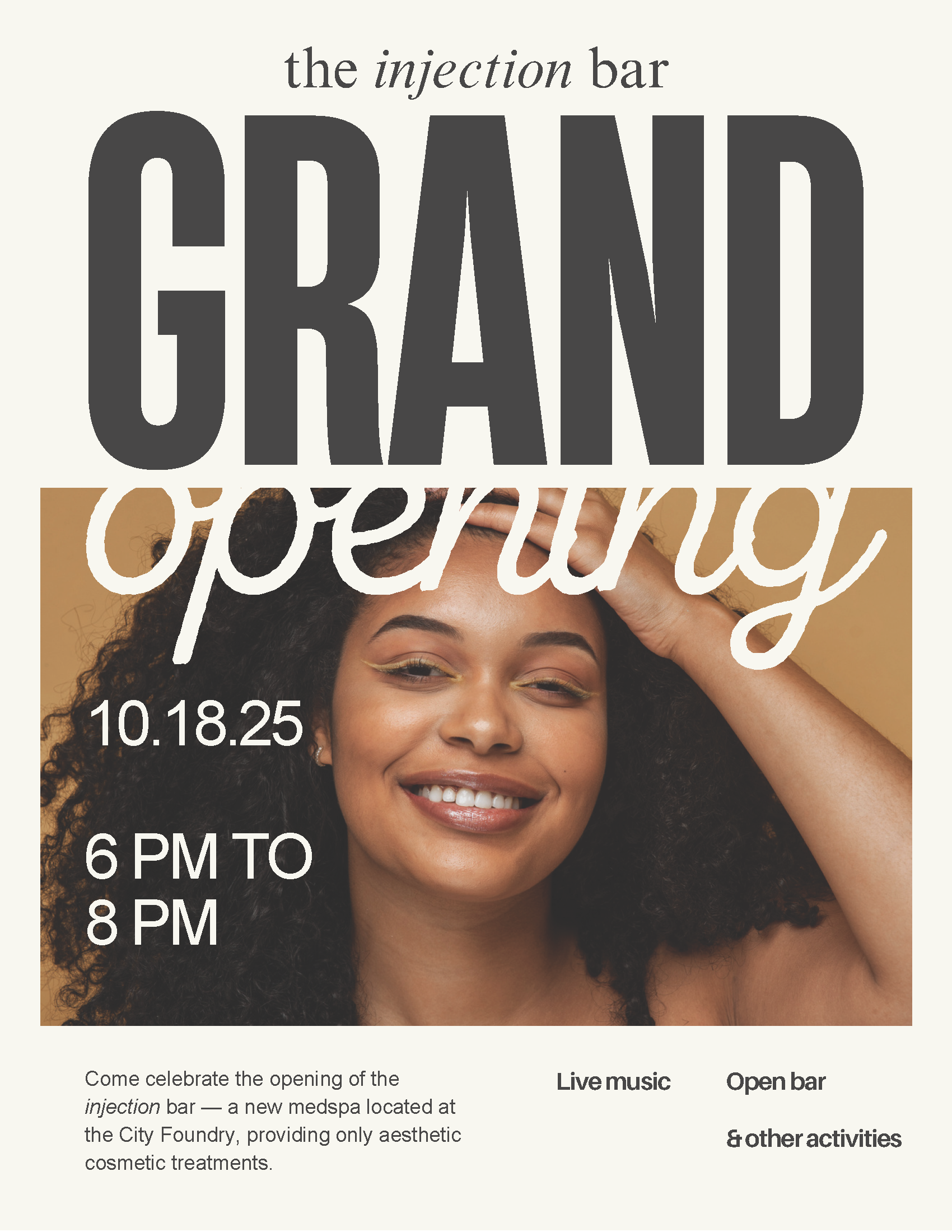 Come celebrate the opening of the Injection Bar — a new medspa located at the City Foundry, providing only aesthetic cosmetic treatments. Live music, open bar, and other activities.